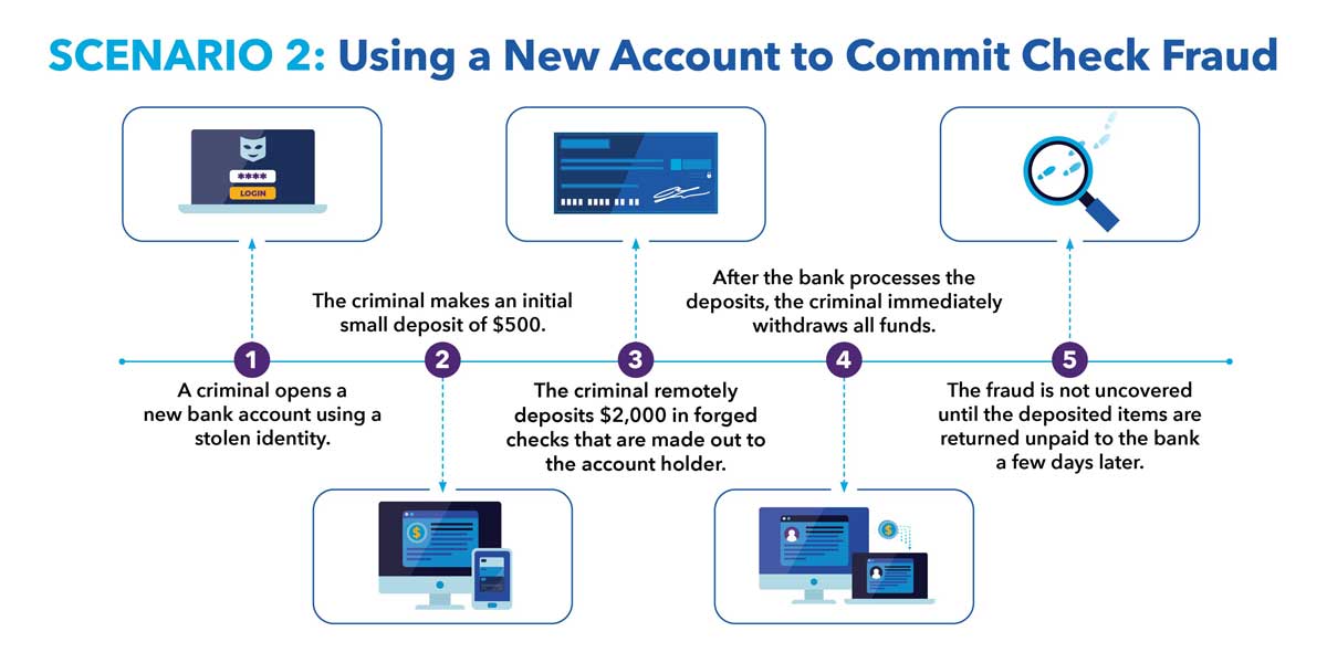Once an account is successfully opened, the criminal may wait months or even years before beginning to carry out fraudulent activities. During this period, the criminal can leave the account inactive or attempt to “season” the account with seemingly benign activity, such as making a series of small deposits and next-day withdrawals, applying for credit or ordering temporary checks. Before long, however, the criminal will begin monetizing the account. Two examples of how this can occur: